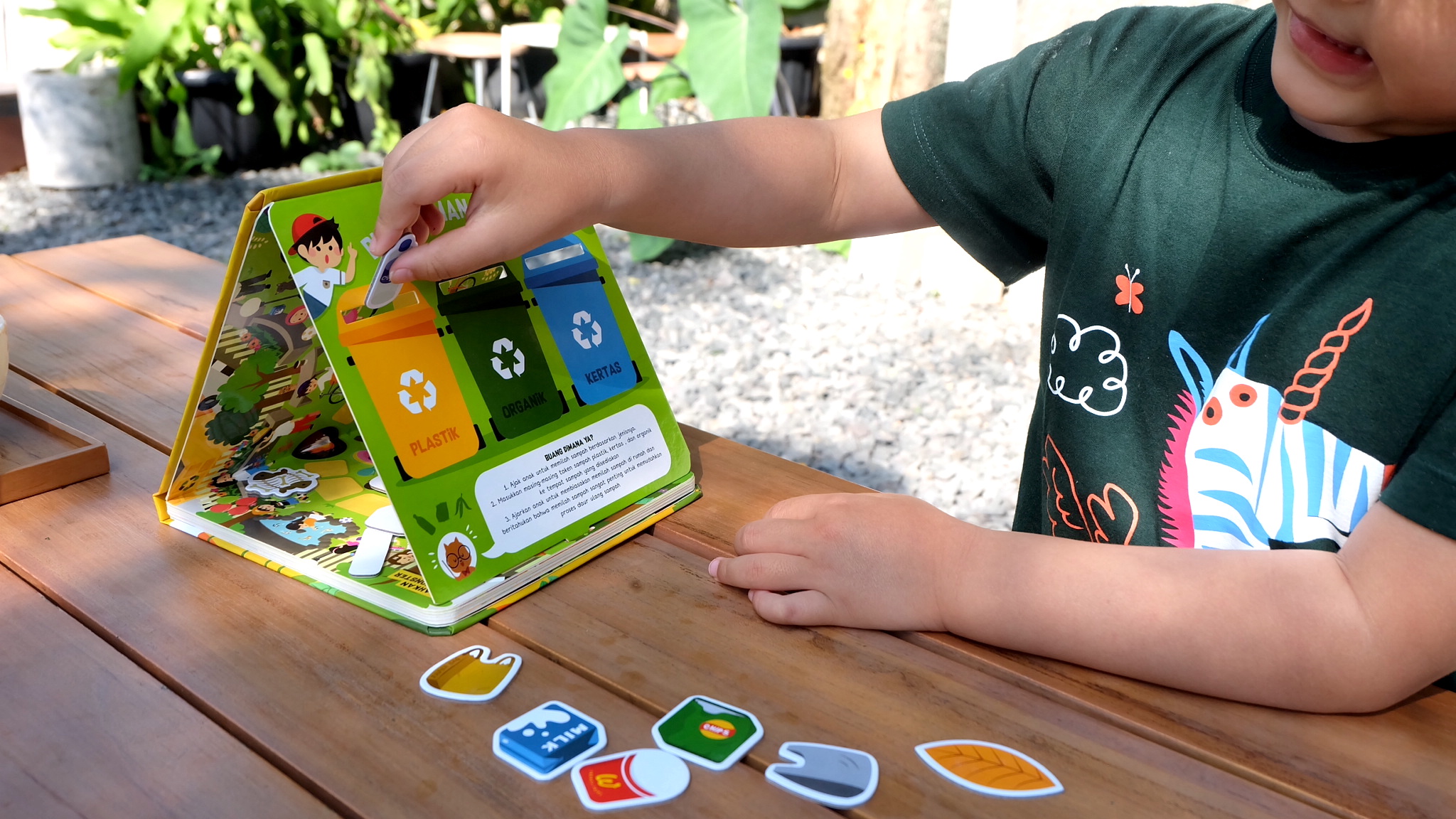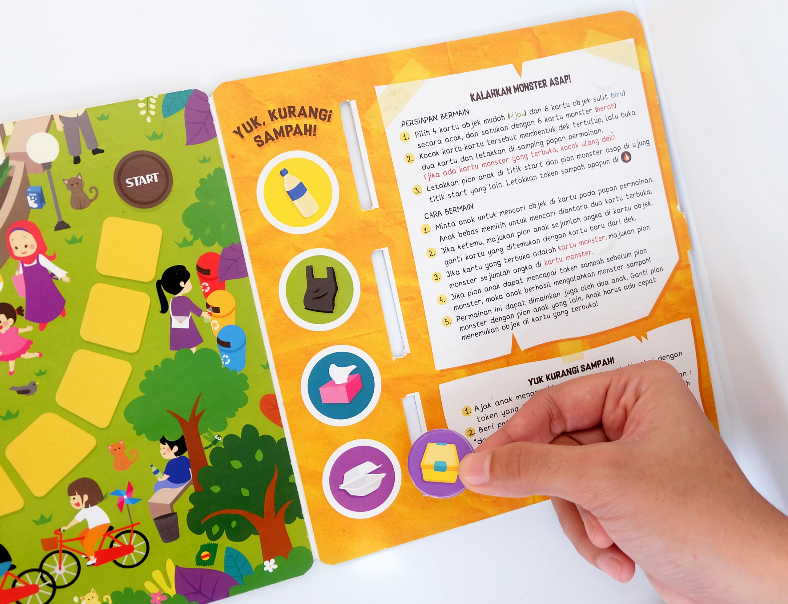 Membawa konsep gamebook, terdapat 4 game yang bisa dimainkan bersama, mulai dari berkreasi dengan sampah, cara mengurangi sampah, kalahkan monster asap hingga memahami pemilahan sampah dengan tempat sampah 3 dimensi. Jadi selain dapat boardbook lift the flap yang menarik, ayah bunda akan dapat juga permainan yang bikin anak betah di rumah!